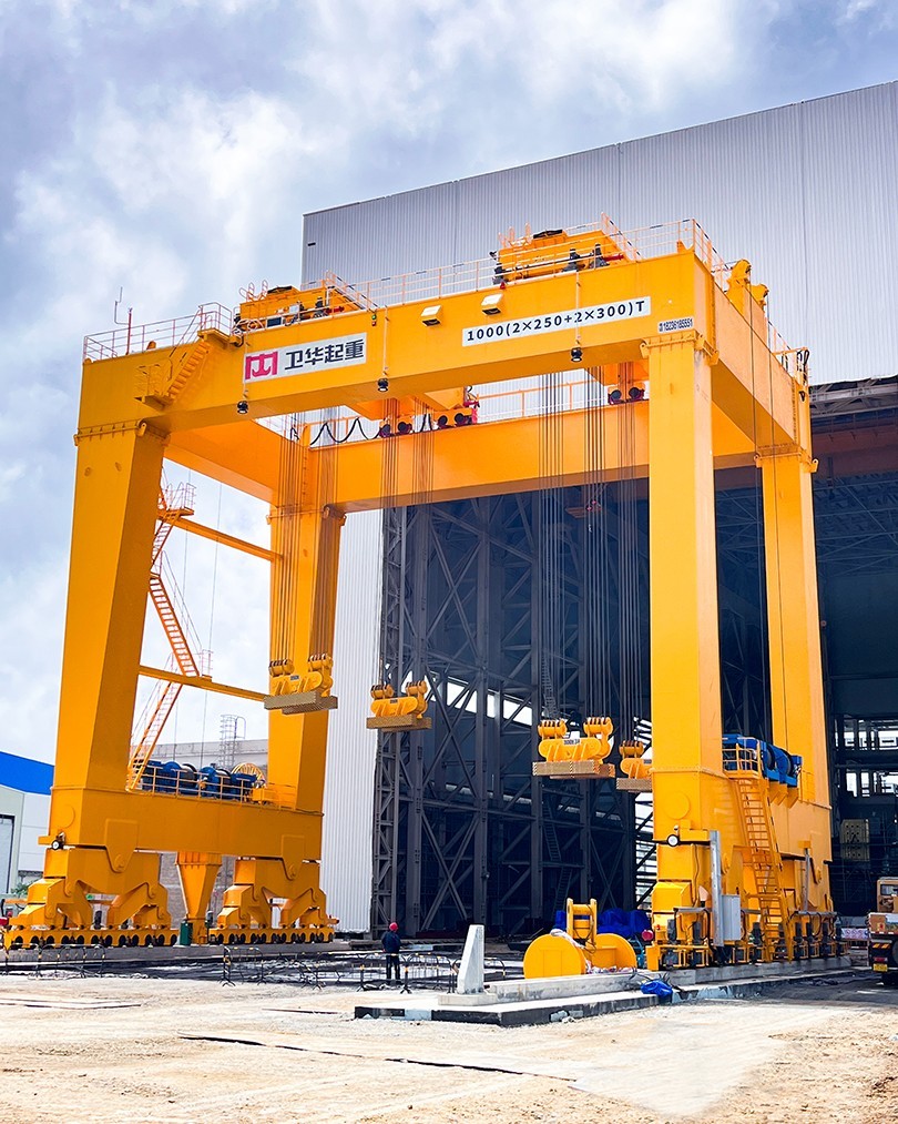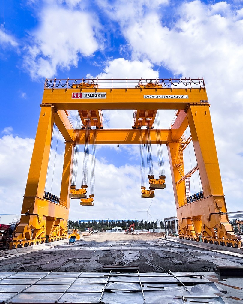 根据项目起吊重量大、工况复杂、控制精度高等特点,bwin·必赢起重机采用U型门架结构,双龙门四点吊装,最大起吊重量1000t,最大吊点高度大于18m,采用变频+PLC控制,可实现横向、纵向距离可调,及吊梁自由旋转,控制精度达±1mm。